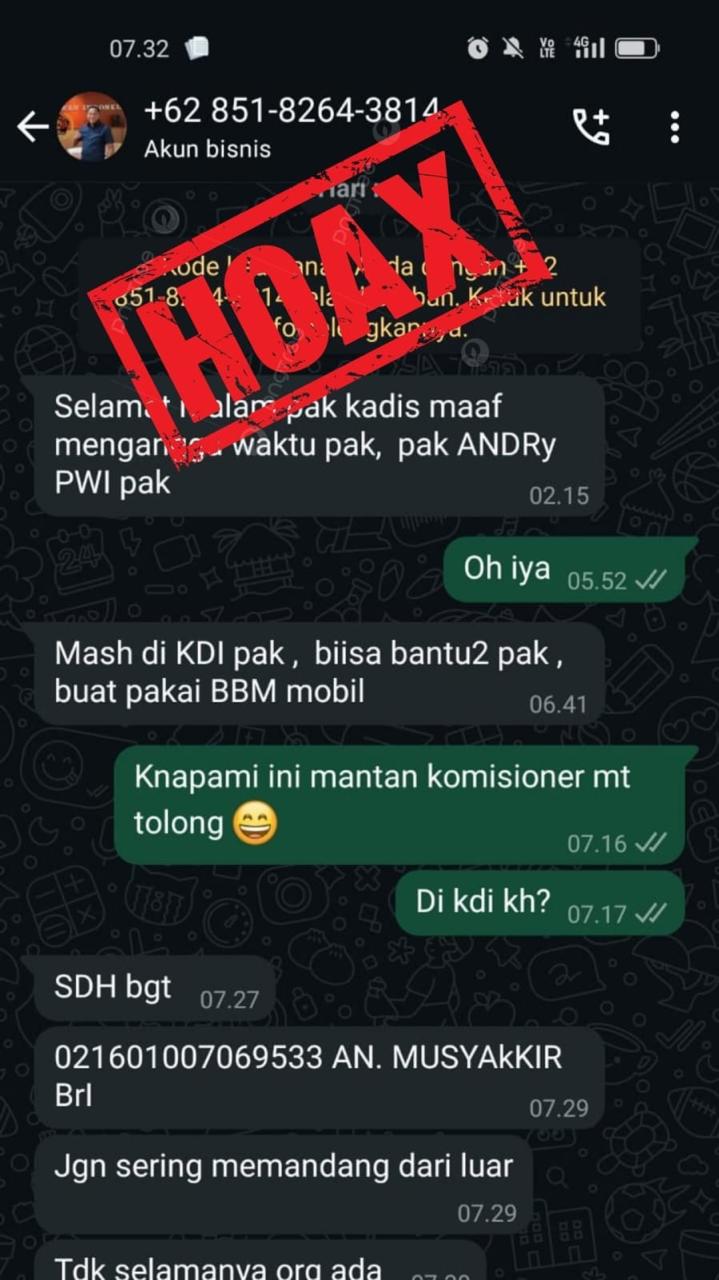 “Pagi tadi saya diberi kabar oleh salah satu pimpinan OPD mengkonfirmasi kalau itu adalah nomor whatsapp ku dan juga nomor rekening BRI 021601007069533 An. Musyakir, yang kemudian disusul dengan screenshoot percakapan penipuan tersebut. Saya pun menyampaikan bahwa nomor telepon saya hanya satu yaitu yang saat ini digunakan. Dan saya pastikan itu adalah penipu.” Jelas Andriansyah.