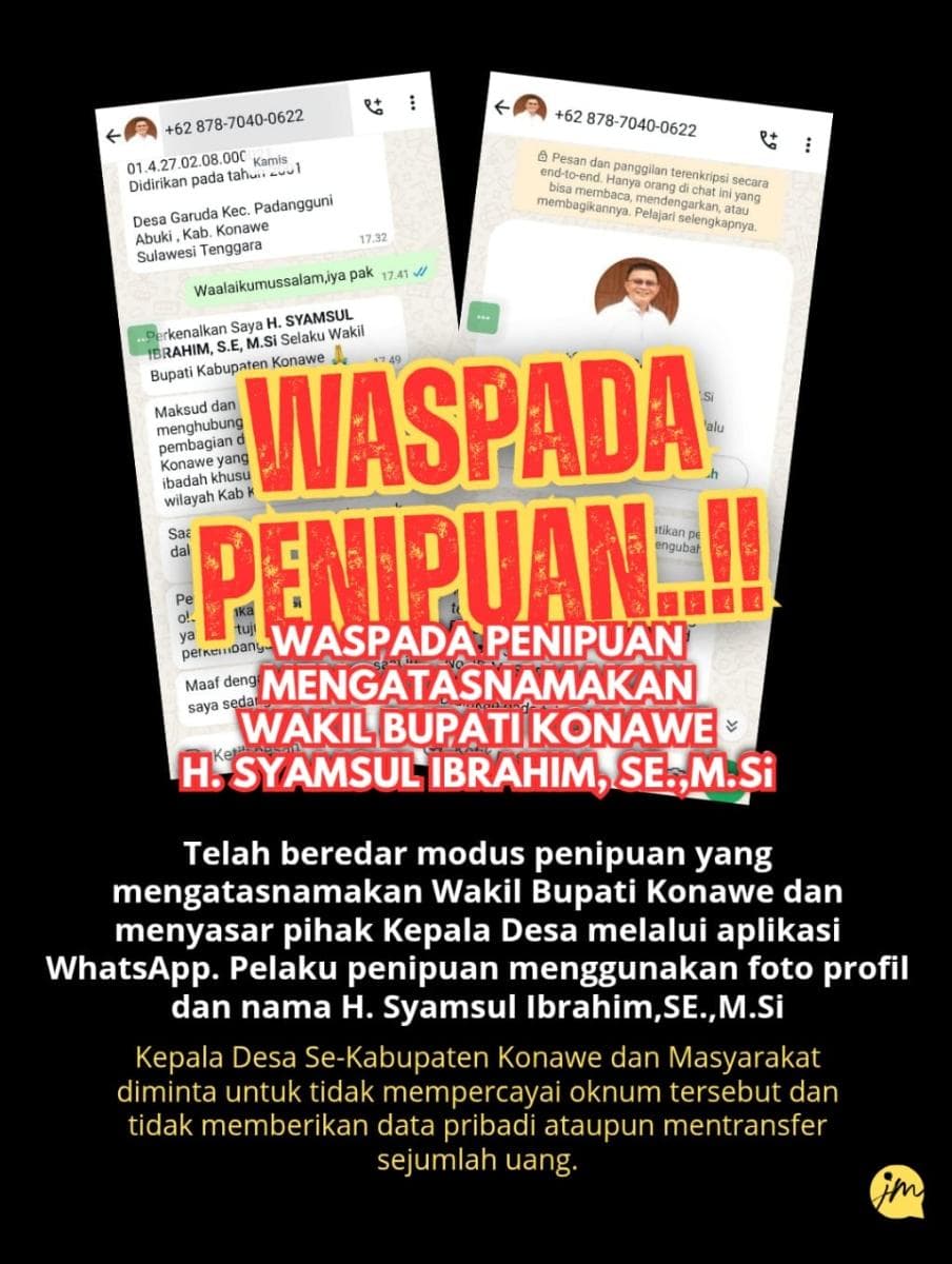 Info-Sultra.com | Konawe, — Aksi penipuan dengan mencatut nama pejabat publik kembali terjadi di wilayah Kabupaten Konawe. Kali ini, nama Wakil Bupati Konawe, H. Syamsul Ibrahim, SE., M.Si, diduga digunakan oleh oknum tidak bertanggung jawab untuk melakukan penipuan dengan modus komunikasi via WhatsApp.
