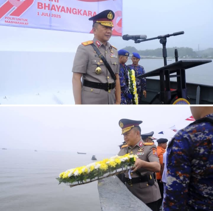 Info-Sultra.com | Kendari – Polda Sulawesi Tenggara (Sultra) menggelar upacara tabur bunga di perairan Teluk Kendari sebagai bagian dari rangkaian peringatan Hari Bhayangkara ke-79, pada Senin, 23 Juni 2025.