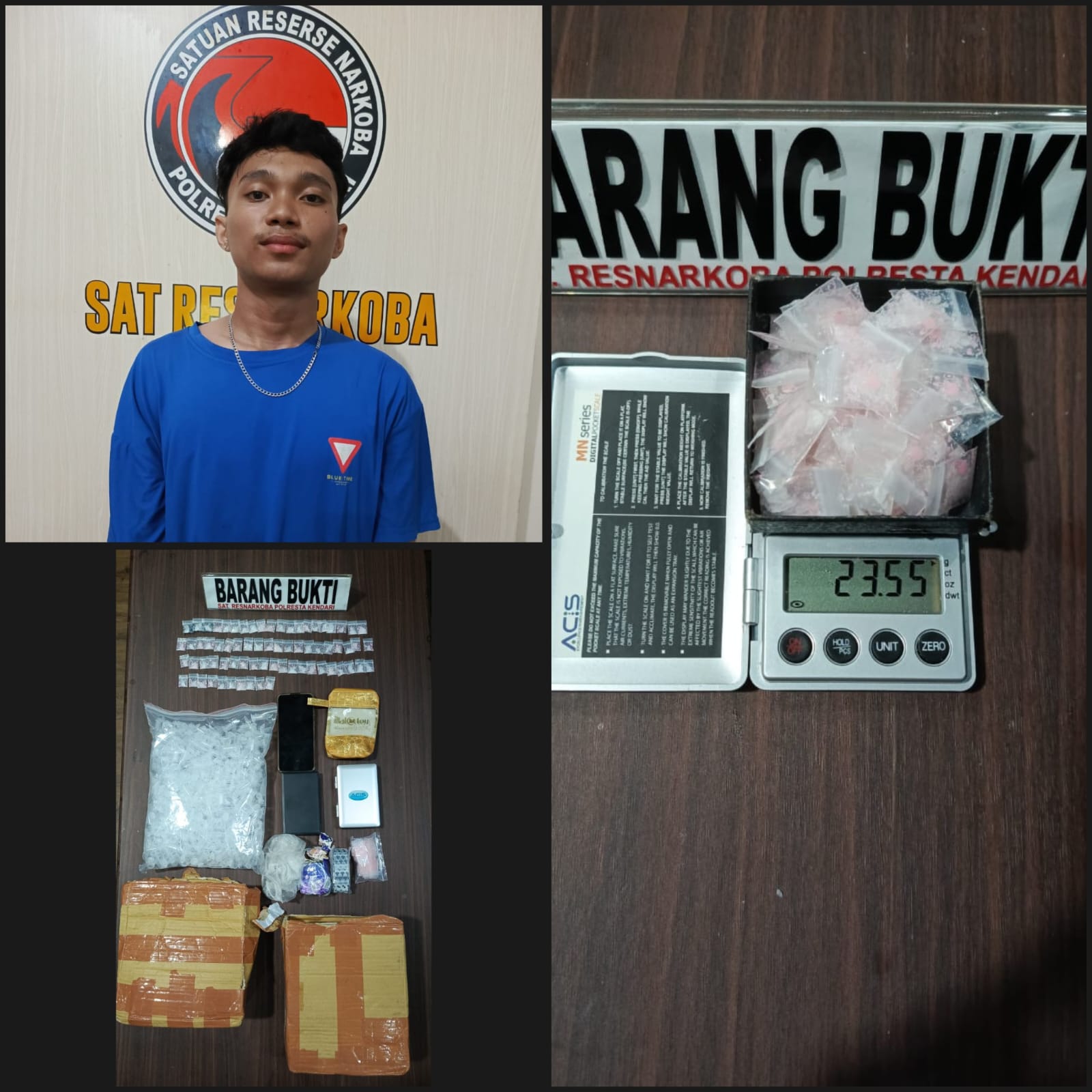 Dari lokasi tersebut, polisi mengamankan, 70 sachet bening berisi kristal diduga shabu dengan berat bruto 23,55 gram, 2 timbangan digital, 1 tas kecil warna coklat, 2 bal plastik bening kosong, 1 bal plastik roket, 1 kantong kresek hitam, 1 bungkus rokok LA Ice, 2 dus coklat, 1 unit handphone Vivo dengan SIM card 0877 6694 1455