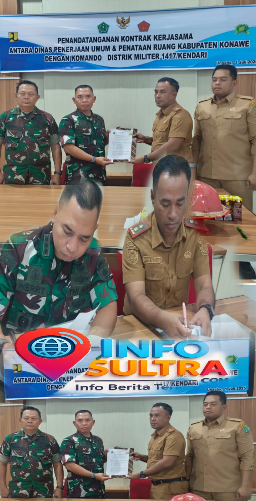 Info-Sultra.com | Unaaha, 5 Juli 2025 — Pemerintah Kabupaten Konawe terus mendorong percepatan pembangunan infrastruktur strategis melalui sinergi lintas-sektor. Terbaru, Dinas Pekerjaan Umum dan Penataan Ruang (PUPR) Kabupaten Konawe resmi menandatangani kerja sama dengan Komando Distrik Militer (Kodim) 1417/Kendari dalam sebuah seremoni yang digelar di Aula Kantor PUPR Konawe, Sabtu (5/7/2025).