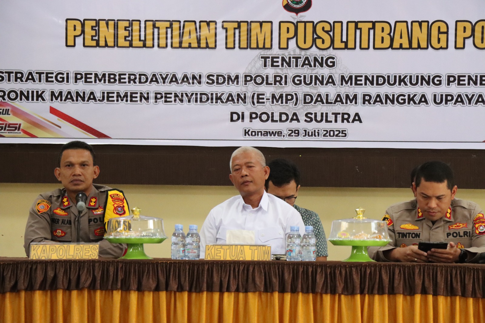 Info-Sultra.con | Konawe, 29 Juli 2025 — Polres Konawe menerima kunjungan Tim Pusat Penelitian dan Pengembangan (Puslitbang) Polri dalam rangka pelaksanaan kegiatan penelitian bertajuk *”Strategi Pemberdayaan SDM Polri Guna Mendukung Penerapan Sistem Elektronik Manajemen Penyidikan (E-MP)”* serta pengkajian peran Polri dalam mendukung program ketahanan pangan.