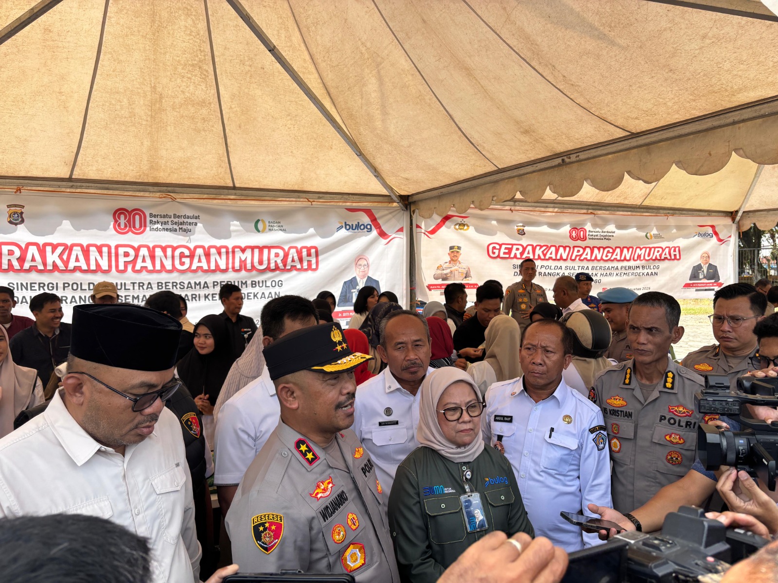 Wakapolda Sultra, Brigjen Pol Amur Chandra Juli Buana, S.H., M.H., hadir langsung dalam kegiatan tersebut bersama Kepala Bulog Regional Sultra, Ir. Mardati Saing, serta sejumlah Pejabat Utama Polda Sultra. Ratusan warga memadati area kegiatan sejak pagi hari untuk mendapatkan beras, gula, dan minyak goreng dengan harga yang terjangkau.