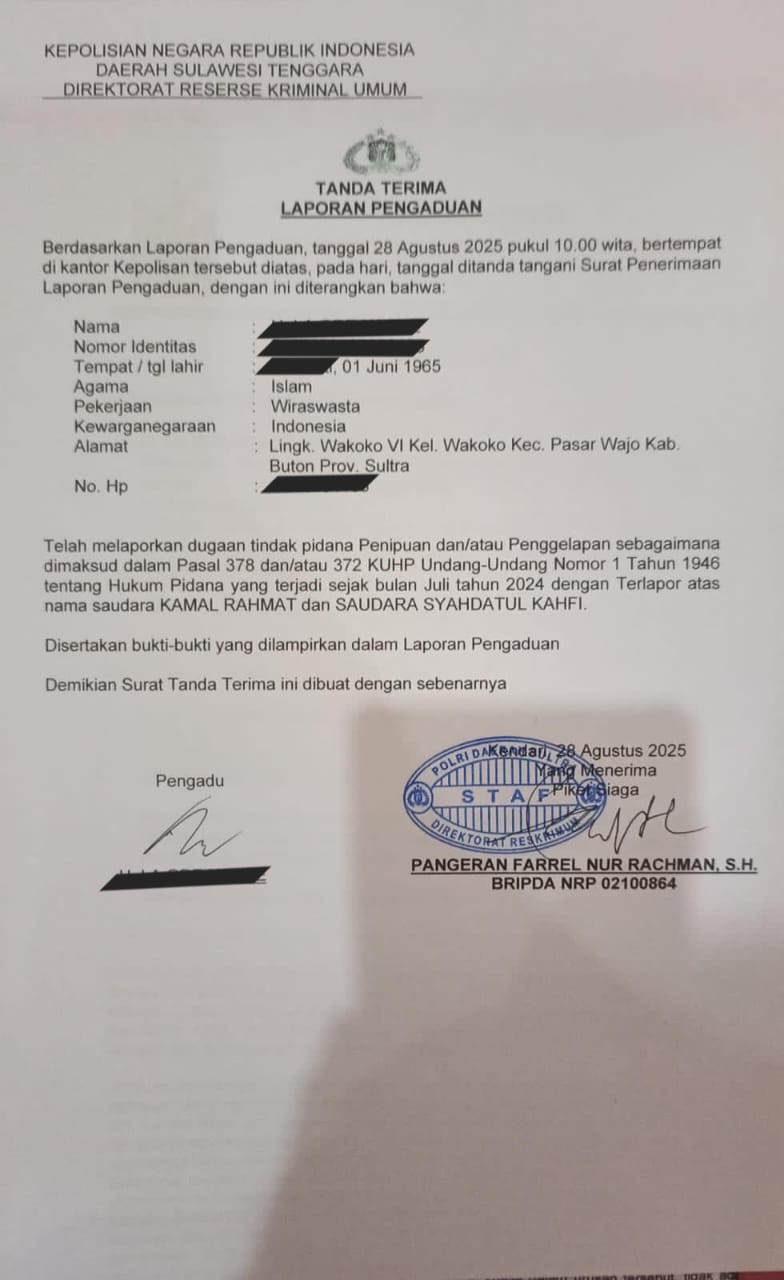 Merasa ditipu, LN akhirnya melaporkan KR dan SK secara resmi di Polda Sultra yang didampingi oleh Tim Kuasa Hukumnya.