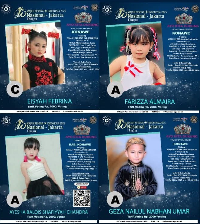 Info-Sultra.com | Konawe — Empat anak asal Kabupaten Konawe, Sulawesi Tenggara, siap menunjukkan bakat dan pesonanya di ajang nasional Wajah Pesona Indonesia (WPI) 2025 yang akan digelar di Jakarta. Mereka adalah Ayesha Balqis Shafiyyah Chandra, Eisyah Febrina, Farizza Almaira, dan Geza Nailul Nabhan Umar, yang akan bersaing dengan peserta dari berbagai daerah di Indonesia.