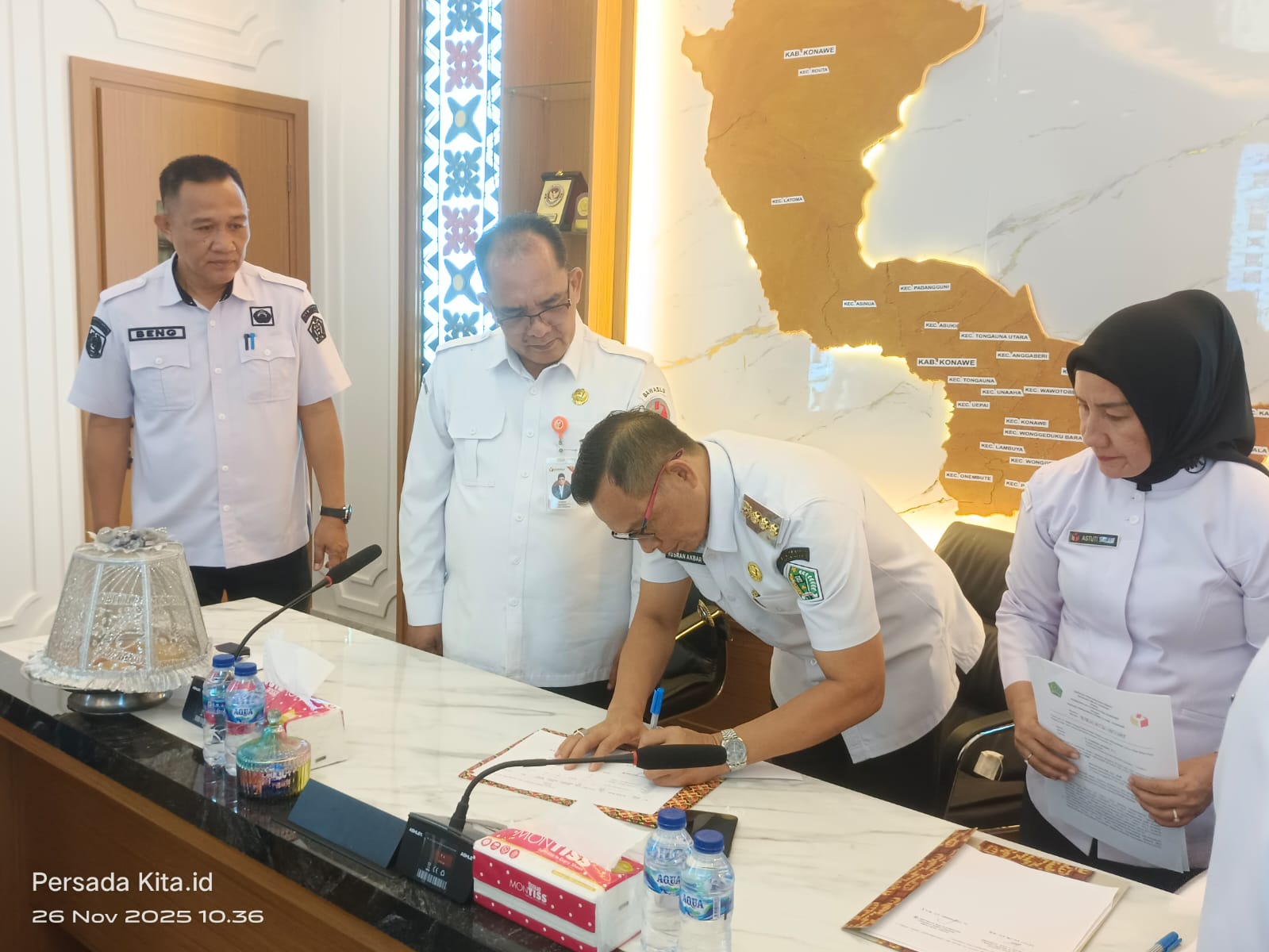 INFO-SULTRA.COM, KONAWE – Bupati Konawe H Yusran Akbar ST didampingi Sekda Konawe, Dr Ferdinand menyerahkan hibah aset Barang Milik Daerah (BMD) berupa tanah dan bangunan kepada Badan Pengawas Pemilu (Bawaslu) Konawe melaui Deputi Bidang ADM Bawaaslu RI, Dr Labayoni, SIp, MSi disaksikan sejumlah anggota dan Sekretariat Bawalu Sulawesi Tenggara, jajaran Bawaslu Kabupaten Konawe dan Bawaslu Kabupaten Kolaka Timur serta Kepala OPD terkait di ruang rapat Bupati Konawe, Rabu (26/11/2025).