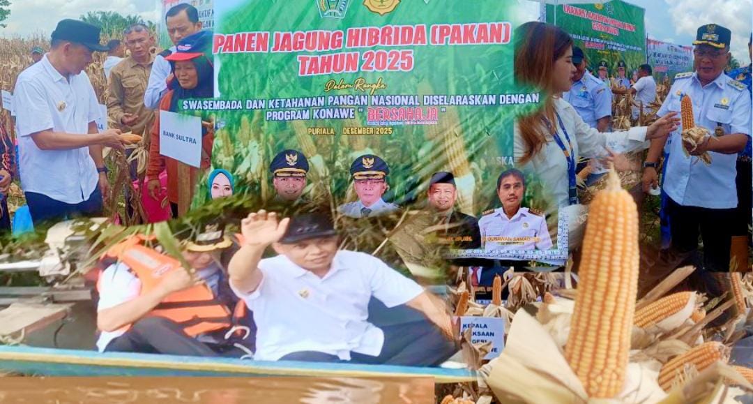 INFO-SULTRA.COM, PURIALA, Konawe — Pemerintah Kabupaten Konawe melaksanakan Panen Jagung Hibrida Tahun 2025 di Desa Tetewonua, Kecamatan Puriala, pada Desember 2025. Kegiatan ini menjadi bagian dari upaya pemerintah daerah mendukung swasembada pangan sekaligus memperkuat ketahanan pangan nasional. Rabu, 17 Desember 2025.