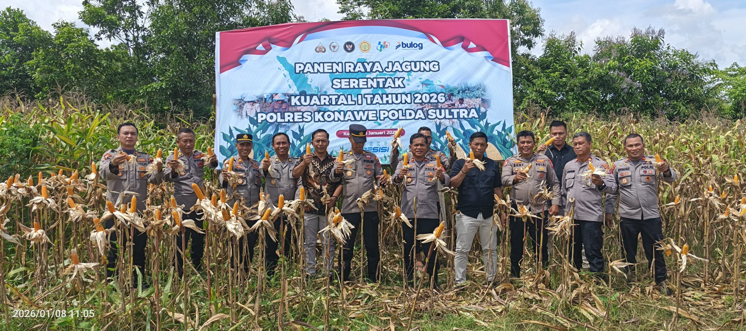 INFO-SULTRA.COM, KONAWE – Komitmen Kepolisian Resor (Polres) Konawe Polda Sulawesi Tenggara dalam mendukung program ketahanan pangan nasional kembali diwujudkan melalui Panen Raya Jagung Serentak Kuartal I Tahun 2026. Kegiatan ini digelar pada Kamis, 8 Januari 2026, sekitar pukul 11.00 Wita, bertempat di lahan jagung Rumah Jabatan Aspol M. Jasin Polres Konawe, Kelurahan Inolobunggadue, Kecamatan Unaaha, Kabupaten Konawe.