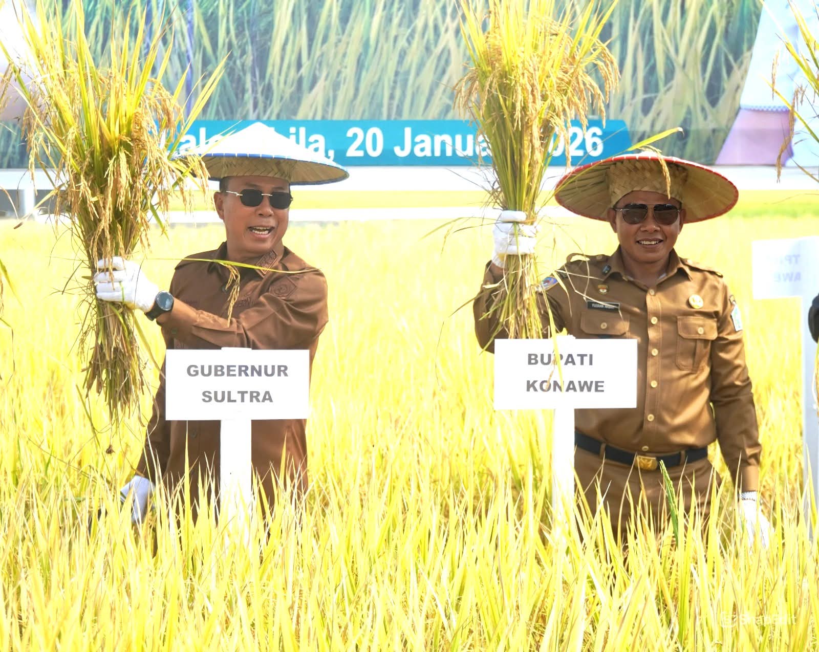INFO-SULTRA.COM, KONAWE – Pemerintah Daerah Kabupaten Konawe melalui Bupati H. Yusran Akbar, ST, mendampingi Gubernur Sulawesi Tenggara, Mayjen TNI (Purn.) Andi Sumangerukka, dalam kegiatan Panen Perdana Perbanyakan Benih Padi sekaligus penyerahan bantuan benih gratis kepada kelompok tani di Balai Benih Induk (BBI) Wawotobi, Selasa (20/1/2026).