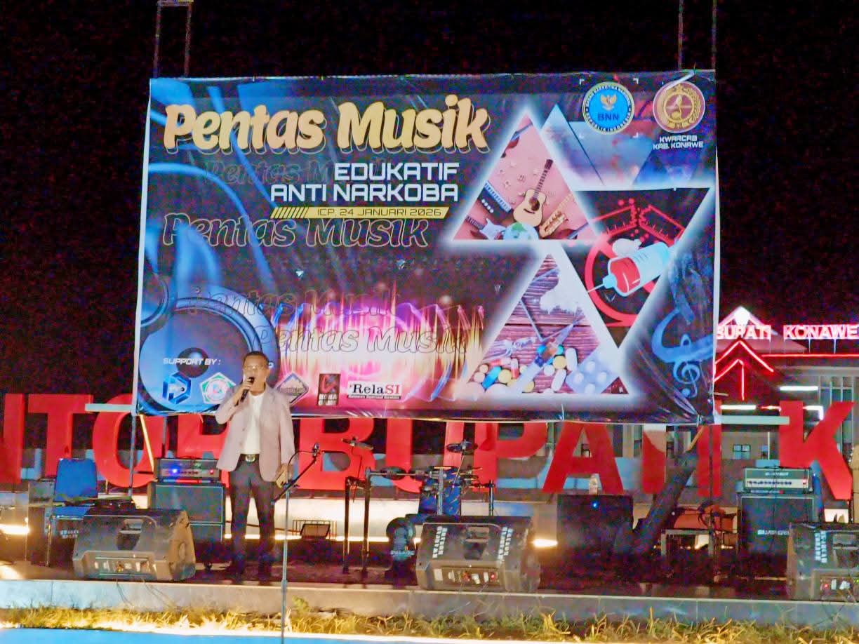 INFO-SULTRA.COM, KONAWE – Malam Minggu, 24 Januari 2026, langit di atas ICP Inolobunggadue Central Park, Kecamatan Unaaha, tak sekadar diterangi cahaya lampu panggung. Kegiatan bertajuk Pentas Musik Edukatif Anti Narkoba itu menjadi magnet bagi ratusan warga. Dentuman musik menggema, memecah sunyi malam, mengalir dari petikan gitar hingga hentakan drum yang membakar semangat para penonton.