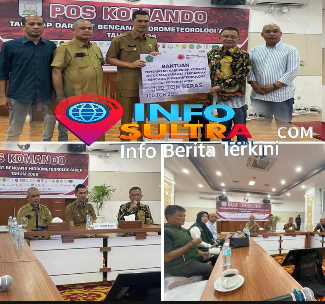 INFO-SULTRA.COM, BANDA ACEH – Pemerintah Kabupaten Konawe secara resmi menyerahkan bantuan kemanusiaan bagi masyarakat terdampak bencana alam di Provinsi Aceh. Bantuan tersebut diserahkan langsung oleh Wakil Bupati Konawe, H. Syamsul Ibrahim, kepada Pemerintah Provinsi Aceh dalam sebuah seremoni di Aula Kantor Gubernur Aceh, Gedung A, Selasa (27/1/2026).