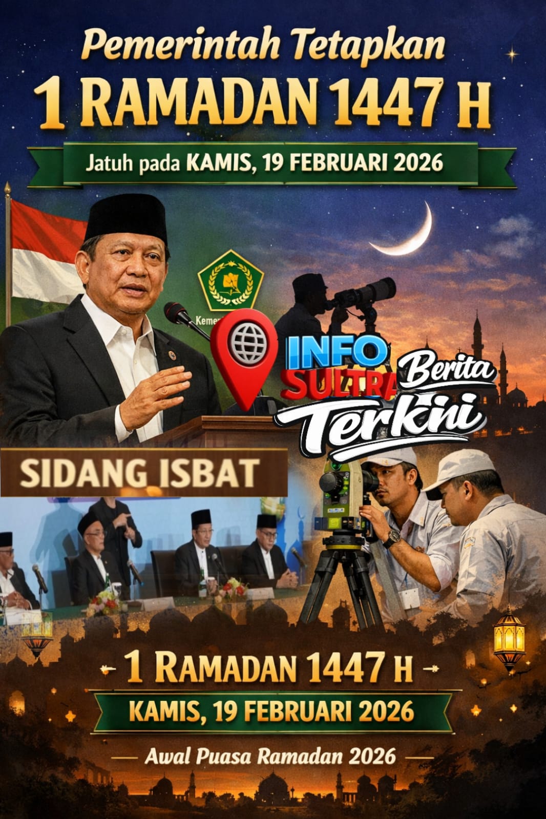 INFO-SULTRA.COM, JAKARTA – Pemerintah melalui Kementerian Agama Republik Indonesia menetapkan 1 Ramadan 1447 Hijriah jatuh pada Kamis, 19 Februari 2026. Keputusan tersebut diambil dalam Sidang Isbat yang digelar di Jakarta, Selasa (17/2/2026).