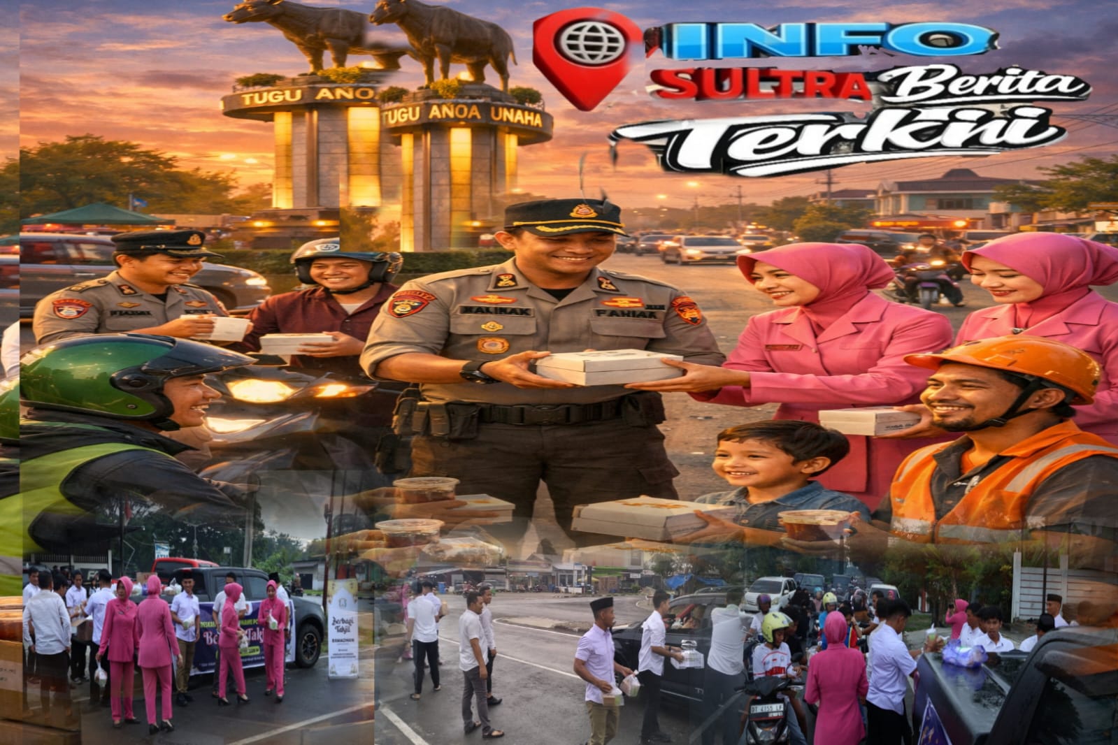 INFO-SULTRA.COM, KONAWE – Senja mulai merayap pelan di langit Unaaha, Sabtu (28/2/2026). Cahaya matahari yang kian redup membias lembut di perempatan Tugu Anoa, Kelurahan Tumpas. Di tengah deru kendaraan yang berlalu lalang dan wajah-wajah yang menahan lapar menjelang azan Magrib, hadir pemandangan berbeda yang penuh kehangatan dan kepedulian.