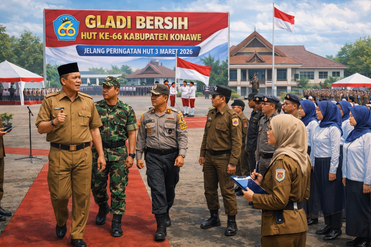 INFO-SULTRA.COM, KONAWE – Pemerintah Kabupaten Konawe menggelar gladi bersih menjelang peringatan Hari Ulang Tahun (HUT) ke-66 Kabupaten Konawe yang akan dipusatkan pada 3 Maret 2026. Kegiatan tersebut berlangsung di halaman Kantor Bupati Konawe, Minggu (1/3/2026).