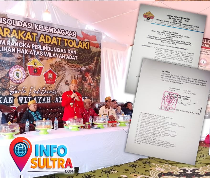 INFO-SULTRA.COM, KENDARI – 27 Maret 2026,  Momentum deklarasi besar masyarakat adat Tolaki di Routa, langkah konkret langsung diambil. Ketua Umum Dewan Pengurus Pusat Lembaga Adat Tolaki (LAT), Dr. H. Lukman Abunawas, S.H., M.Si., M.H., resmi menandatangani keputusan penguatan dan perlindungan hak-hak masyarakat hukum adat Tolaki di wilayah Routa.